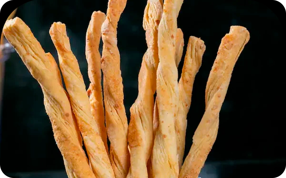 Pequenos bastões assados com massa folhada. Receita típica de Turim e da culinária Italiana em geral. Excelentes pedida para entrada. 100g aprox.